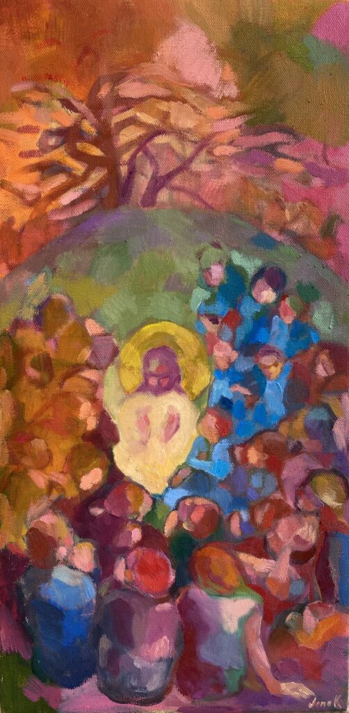About Painting People were often hungry and tired, and due to crowds, many couldn’t see or hear much – yet grace was still flooding their hearts. Details Oil on canvas, 10″x20″.