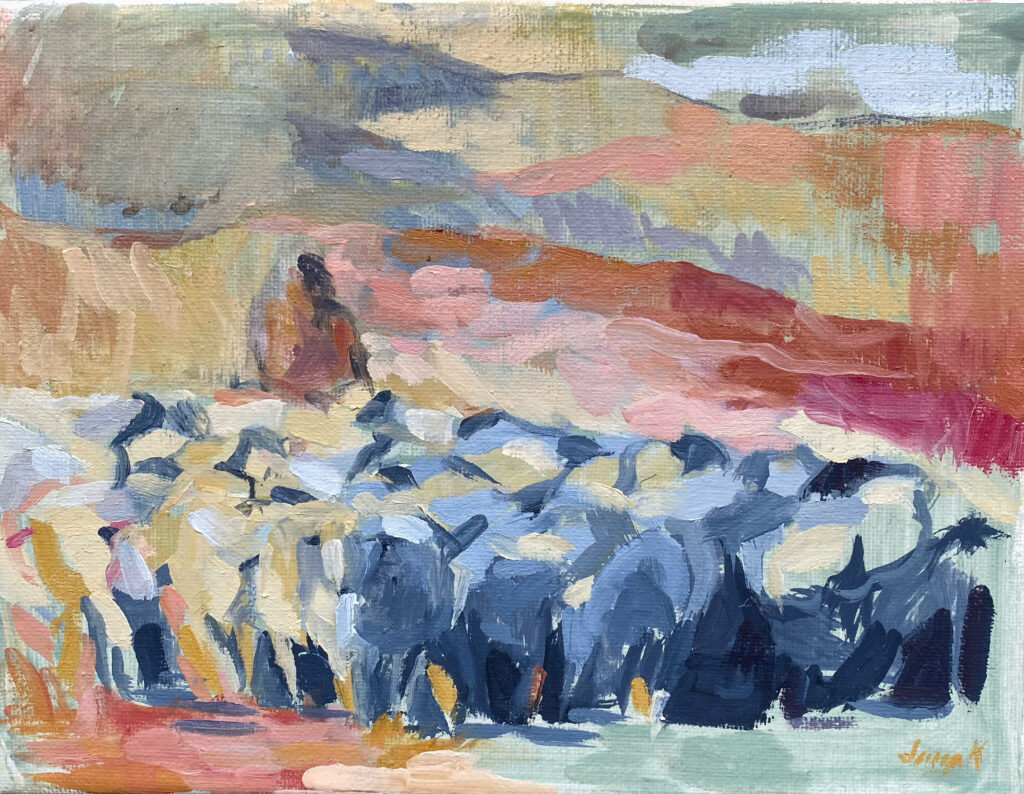 This original oil painting, executed on a 9″x7″ stretched canvas, is rendered in an expressive style, yet softened by a gentle palette of blues and light oranges. The entire scene—featuring a shepherd and a flock of sheep—is bathed in the warm light of the morning sun, creating a calming atmosphere. The gentle interplay of color and light evokes a peaceful rural moment, inviting viewers into a serene, pastoral setting.