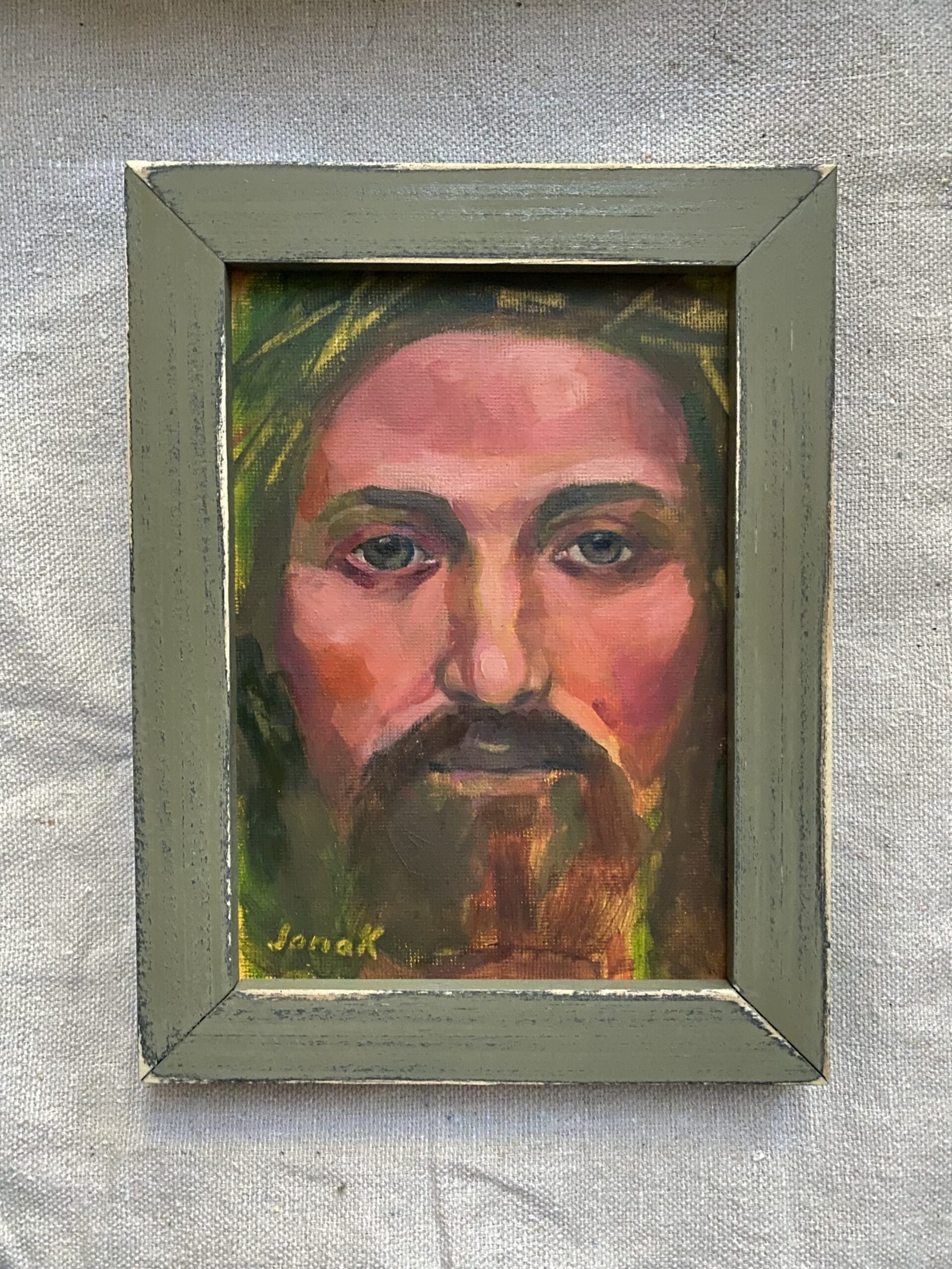 This is an original art piece, portrait of Jesus after Shroud of Turin. The artwork is rendered in realistic style with warm hues of pink, brown and green. The canvas board is framed in a wooden frame of olive green color. The shipping is included in the price. Painting will be shipped with USPS Priority Flat Rate Envelope (within USA).